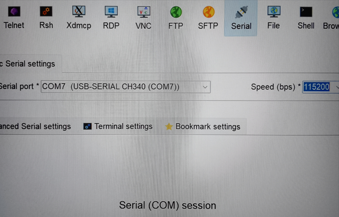 我这里用的终端工具是MobaXterm,选择串口,设置波特率为115200。